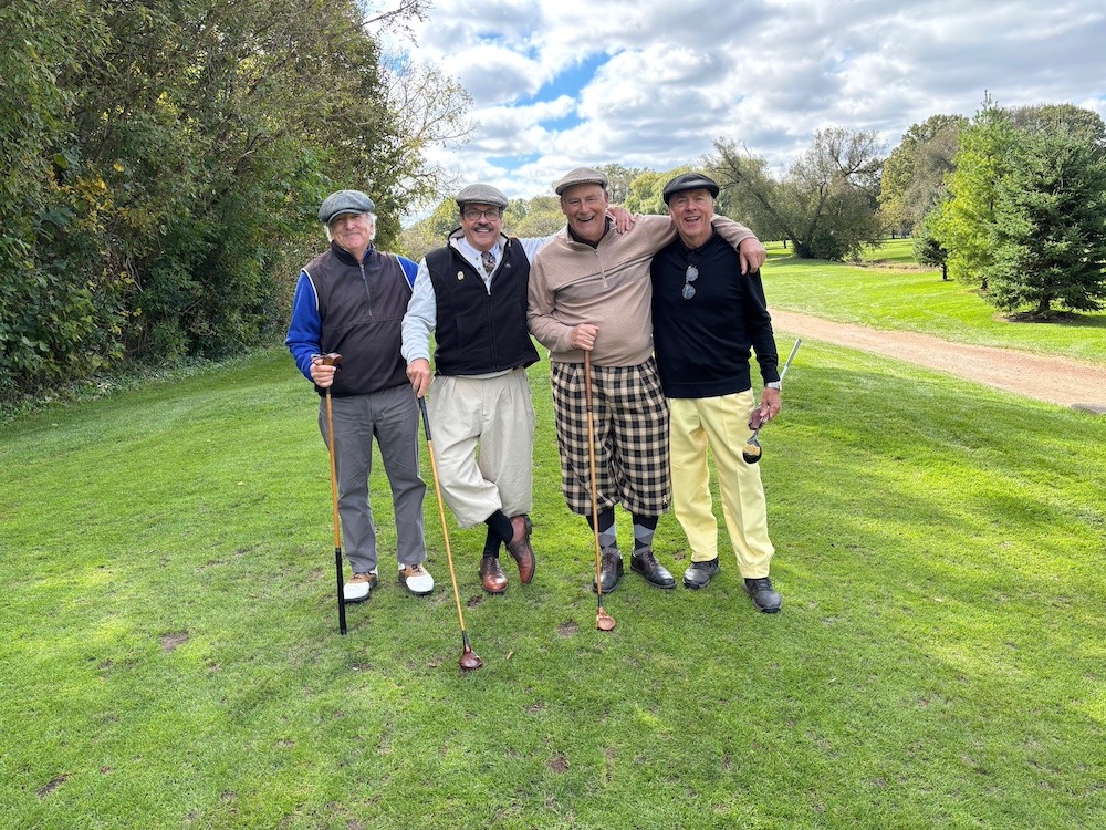 An interesting wrinkle with the day’s play was that players using historical golf clubs (those with steel, aluminum or hickory shafts, and also small-headed woods) each received a one-shot bonus handicap deduction from the team’s final scramble score. If a scramble team shared a set of historical clubs for the round, they similarly received a total one-shot bonus deduction for the team.